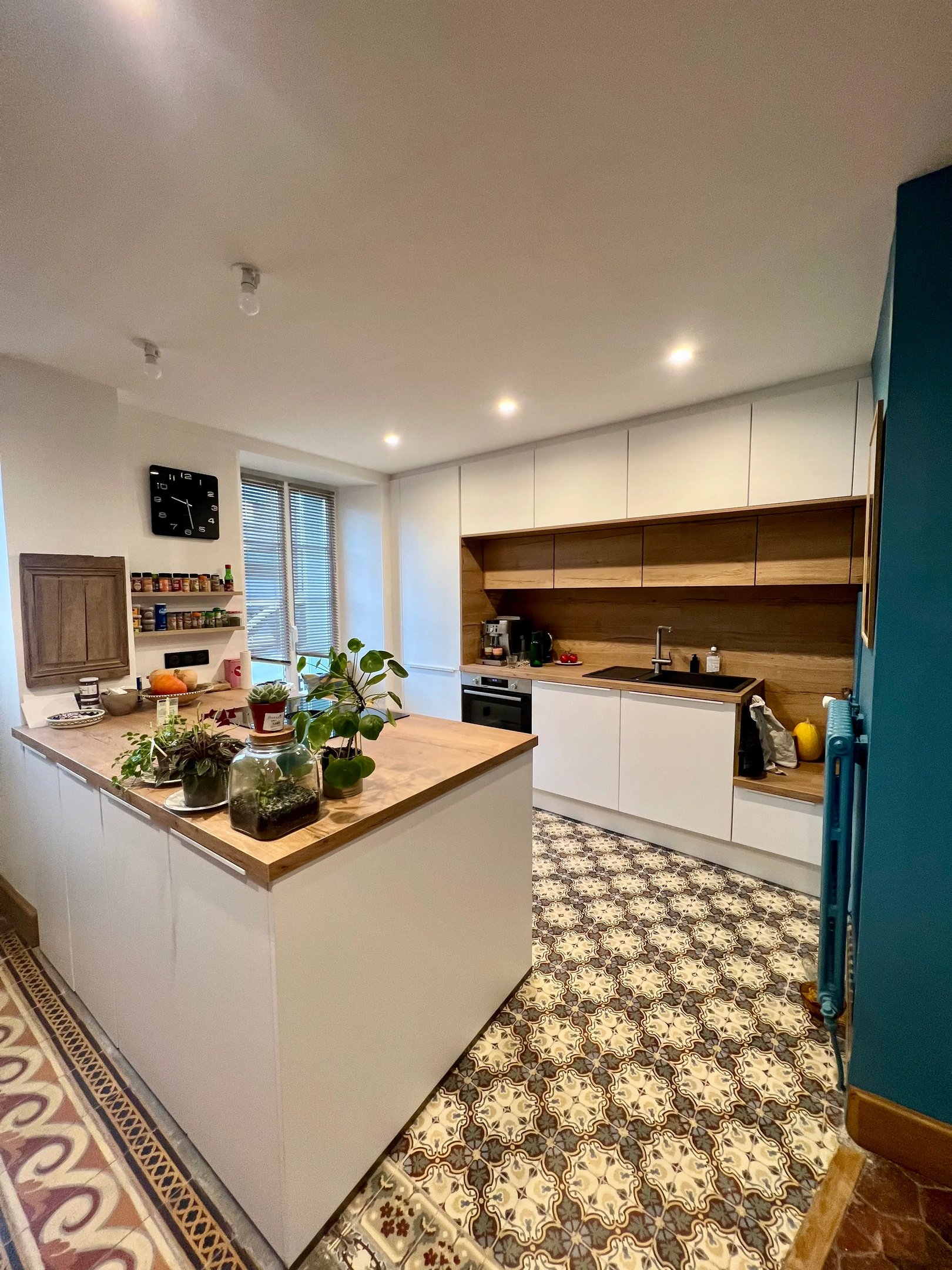 Conception et réalisation d’une cuisine fonctionnelle et esthétique. Agrandissement de la buanderie et dissimulation du passage par des portes de placard.