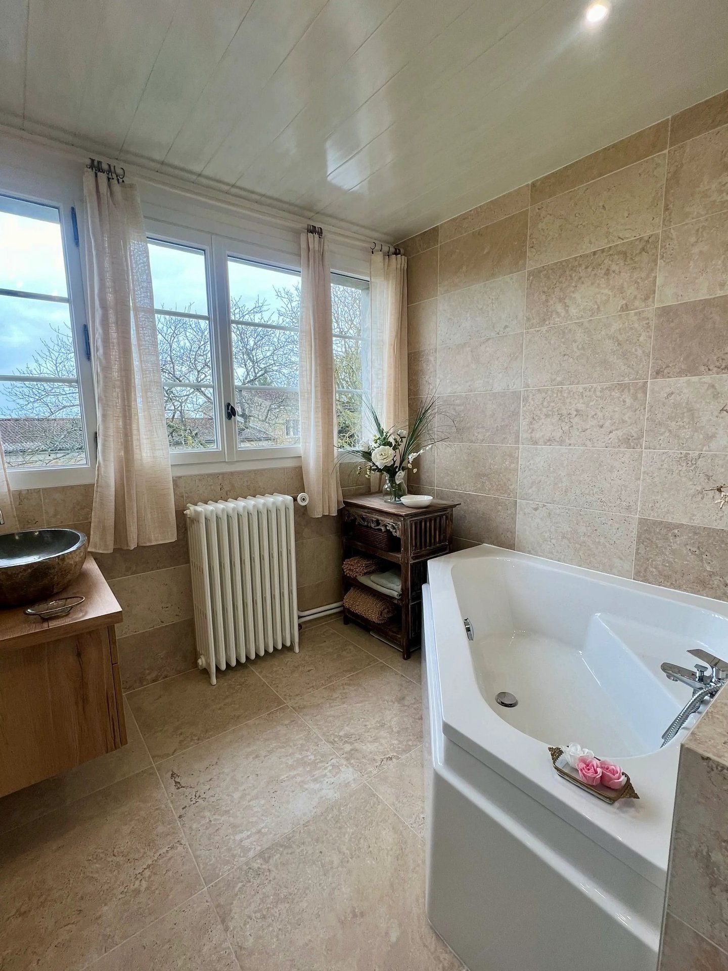 La vasque en pierre naturelle apporte une touche authentique et élégante.