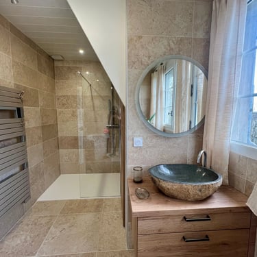Baïa Home a accompagné les clients dans la conception globale, la sélection des matériaux et la coordination des travaux afin de créer une salle de bain à la fois moderne et chaleureuse, parfaitement adaptée à leur quotidien.