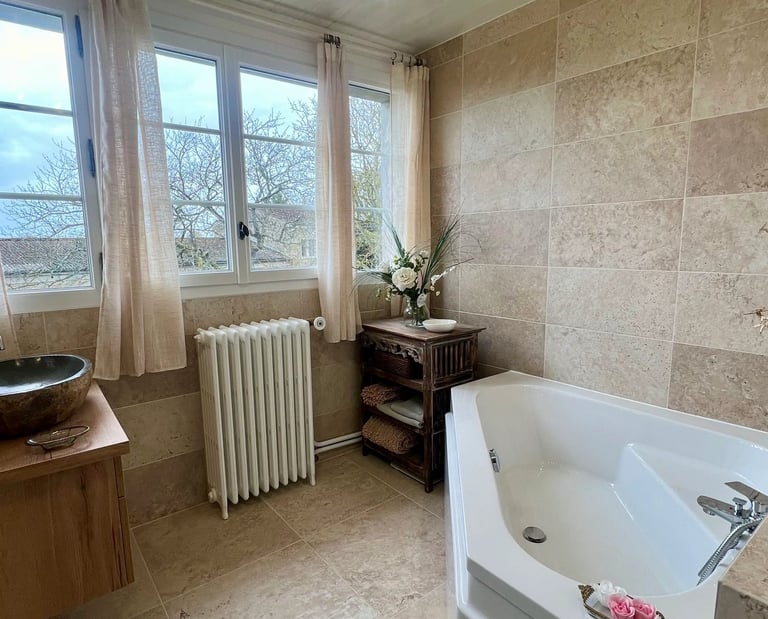 La baignoire existante a été conservée et intégrée dans un ensemble harmonieux, permettant de répondre aux besoins de toute la famille.
